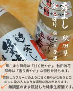 秀よし 寒しぼり 純米生原酒 500ml 鈴木酒造(秋田県) 商品コード:01-038-10-02 在庫状態 : 在庫有り ¥1,400(税込) 数量本 20歳未満の方への酒類の販売は行っておりません 寒絞りとなる旬のお酒で、一切加熱処理をせず、無調整のまま瓶詰した純米生原酒です。 注目すべきは、華こまち酵母と秋田流花酵母(協会1501号)のダブル酵母を使用していること。 華こまち酵母は「甘く艶やか」、秋田流花酵母は「香り爽やか」な特性を持ちます。 さらに秀よしの通常の純米酒の約半分の仕込み量で、非常に丁寧に仕込んでいます。 - 銘柄/蔵元 紹介 - 秀よし 鈴木酒造(秋田県) 創業は江戸時代初期の元禄2年。現在も受けついできた技と心を大切に、品格ある大吟醸酒からスパークリング清酒などの新たなジャンルのものまで、全量自家精米でキレの良いバランスの取れたお酒を生産しております。 この銘柄/蔵元ページへ