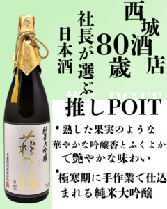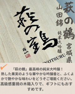 萩の鶴 純米大吟醸 山田錦 木箱入り 1.8L 萩野酒造 (宮城県) 商品コード:01-006-018-01 在庫状態 : 在庫有り ¥11,000(税込) 数量本 20歳未満の方への酒類の販売は行っておりません 「 萩の鶴」最高峰の純米大吟醸! 熟した果実のような華やかな吟醸香と、ふくよかで艶やかな味わいをどうぞご堪能ください。 高級感重視の木箱入りで、ギフトにもおすすめです。 - 銘柄/蔵元 紹介 - 萩の鶴 萩野酒造 (宮城県) 100人の嗜好に合わせて100人がおいしいと感じられる酒が一般的には理想なのかもしれませんが、私たちは自ら飲んで本当に美味しいと思える酒を造りたいと思い、酒の造り手として、料理を活かしつつも、料理と共に記憶に残るような個性ある酒を追求しようと考えております。 この銘柄/蔵元ページへ